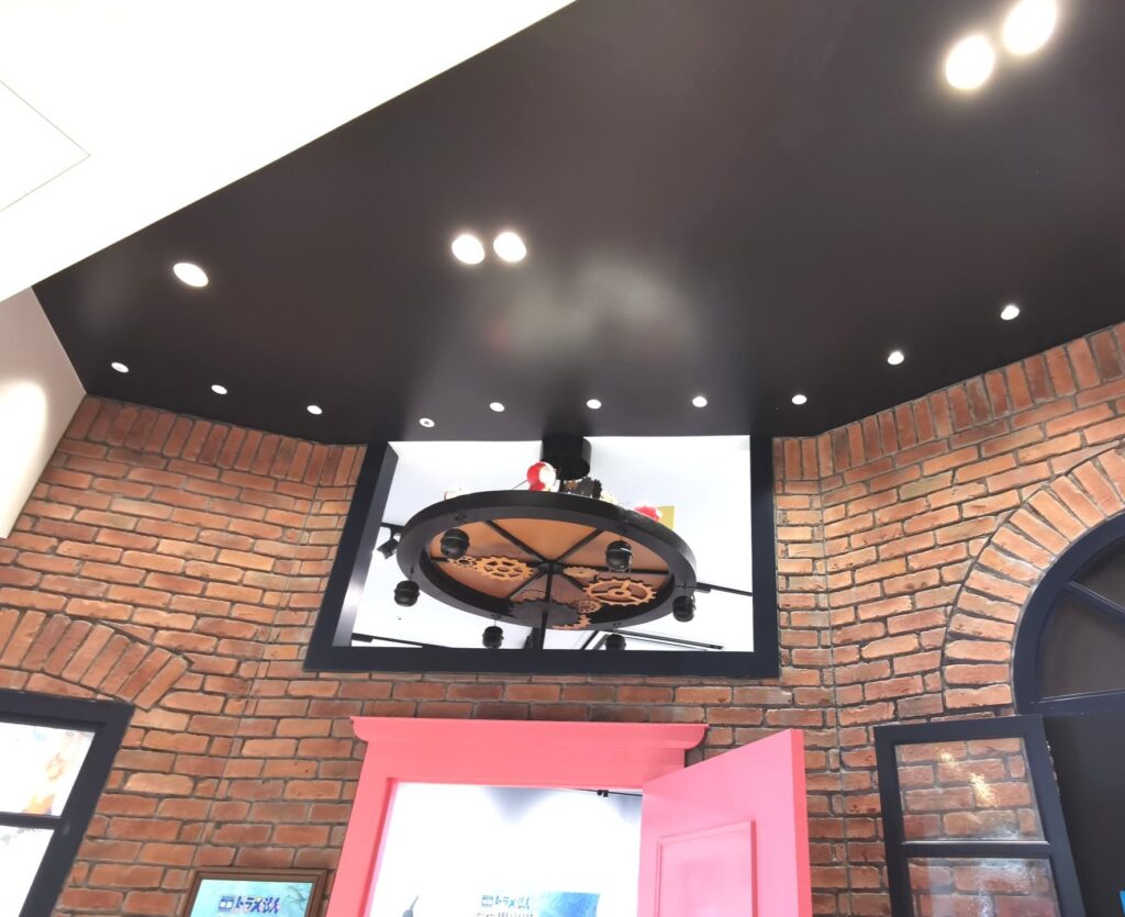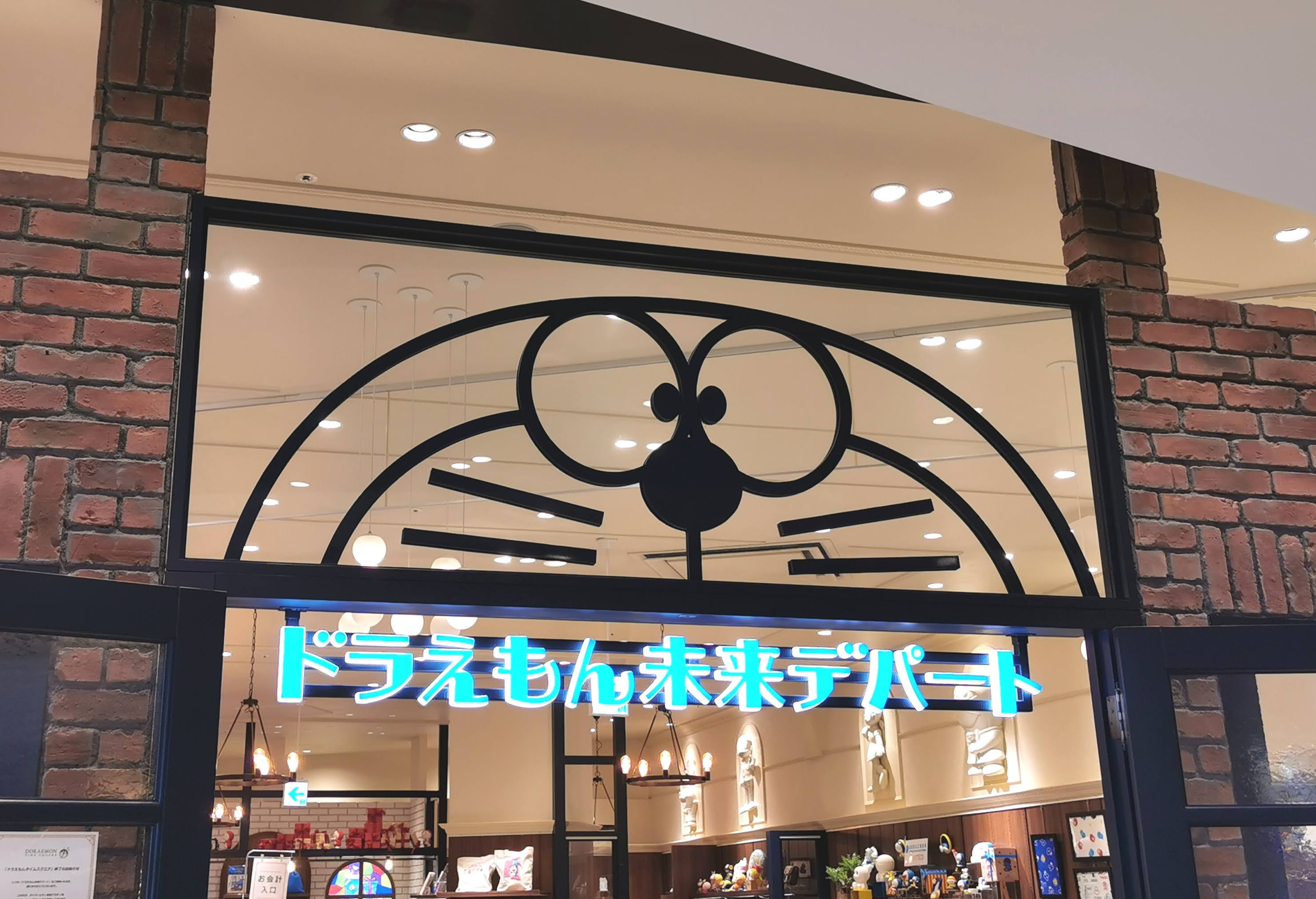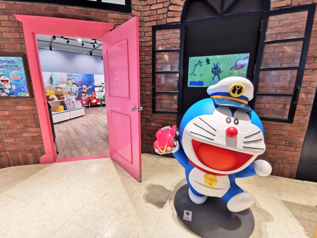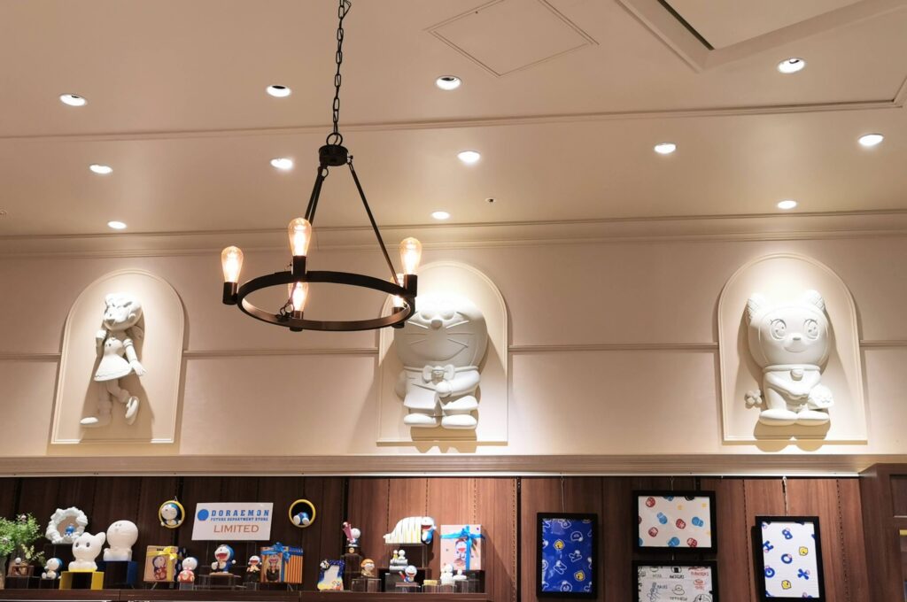 店内の上部にはキャラクターのモニュメントがあり、ドラえもんの世界観が広がります。