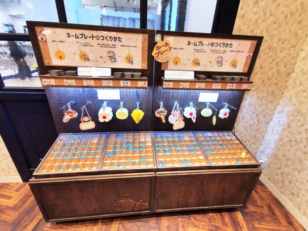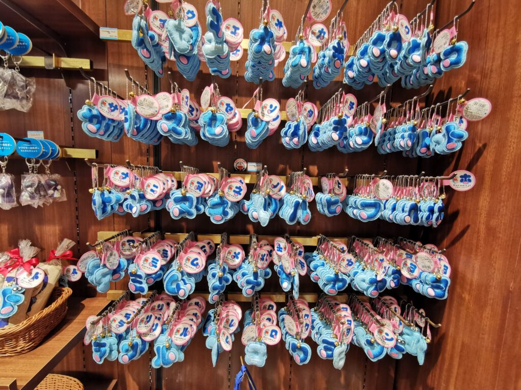 隣にはアンキパンのキーホルダーやドラえもんデザインの鞄もあります。