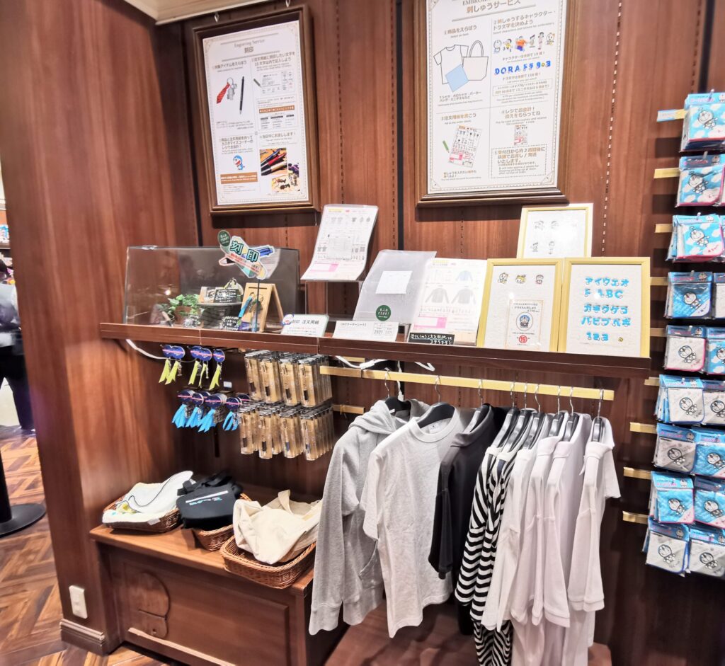 Tシャツ、パーカー、タオルなどの布製品にキャラクターやドラ文字の刺繍をしてくれるサービスもあります。