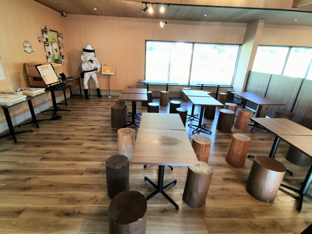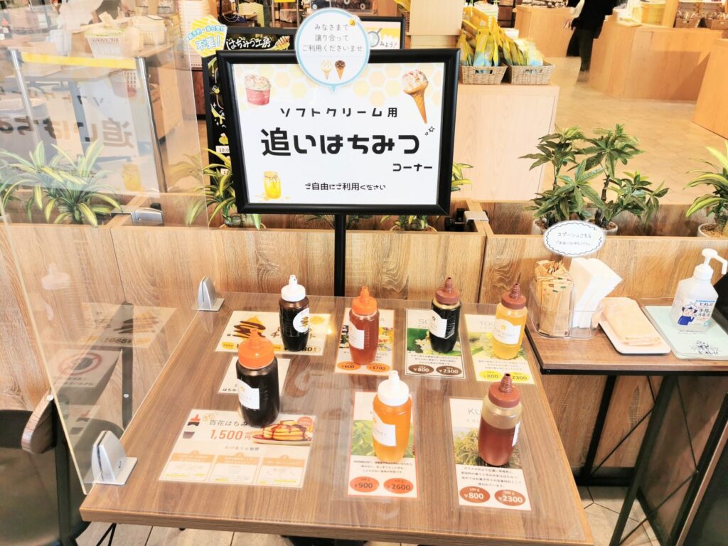 屋内の飲食スペースには、ソフトクリームにかける「追いはちみつ」が置かれており、なんと、はちみつかけ放題です!
