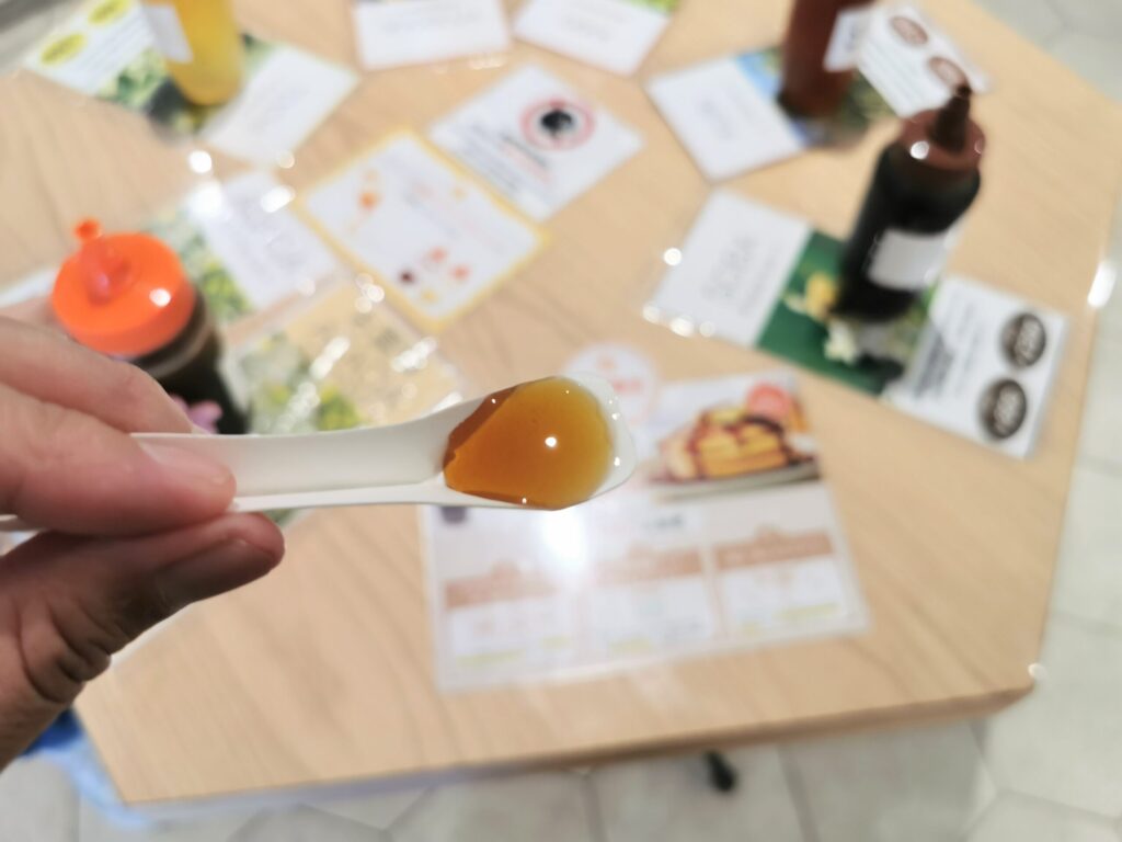 ソフトクリームの追いはちみつとは別に試食用のテーブルが用意されており、紙スプーンにはちみつを出して試食します。