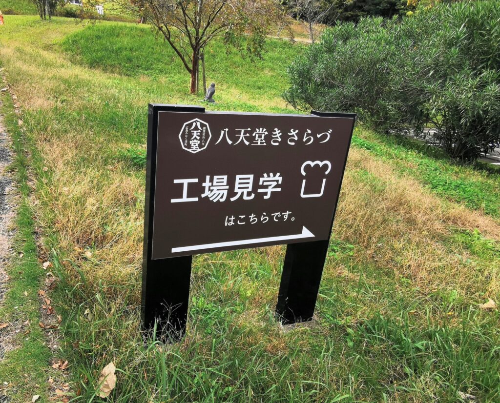 八天堂きさらづには、道沿いに「工場見学はこちら」の看板があるため、そこから駐車場に入ります。