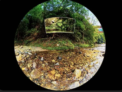上空から川に向かって下降していく映像や、川の水面の上をなぞるように飛ぶ映像もあります。