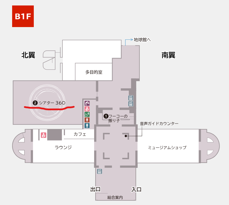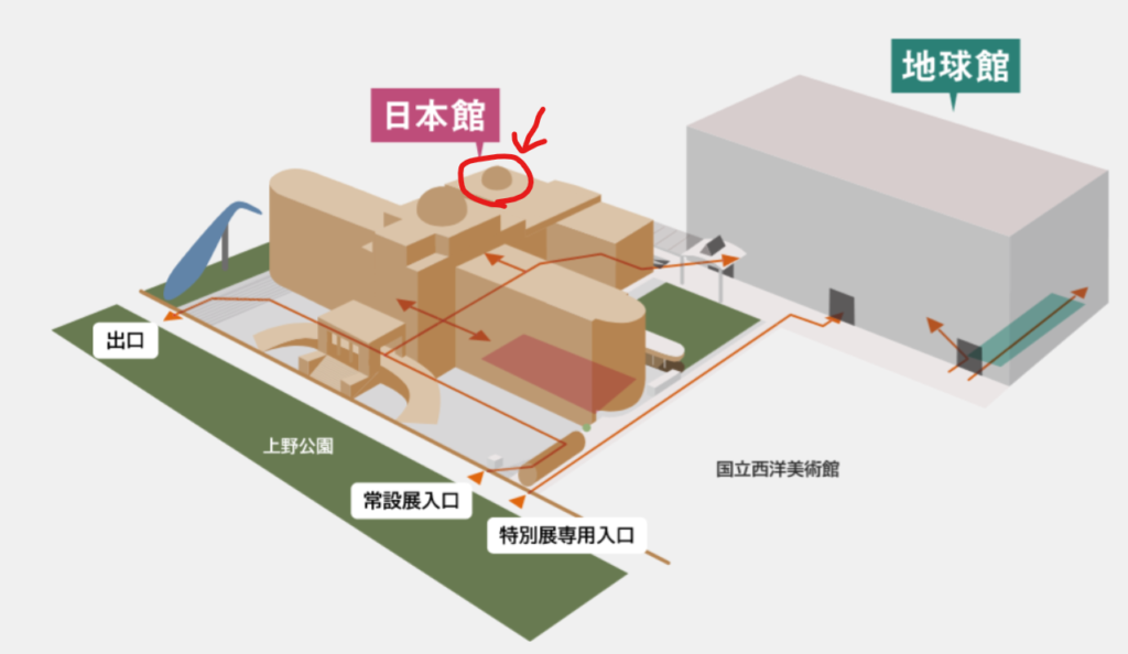 国立科学博物館の日本館の地下1階(B1F)にあります。(以下地図の赤丸の地下1階です。)