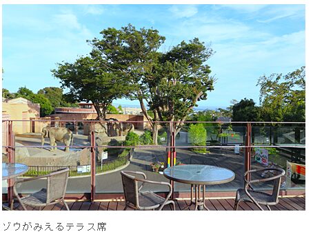 外のテラス席からは、ゾウを眺めながら食事をする事ができ、動物園のランチを味わえます。
