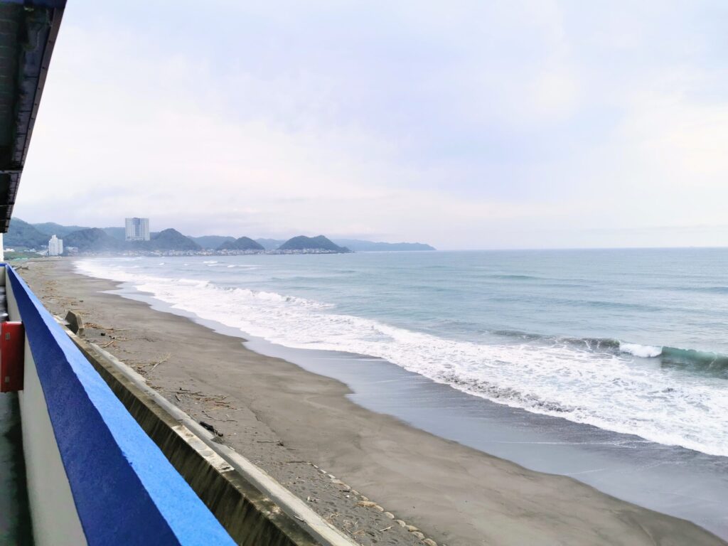 座席の一番上まで上がると、後ろは海で砂浜があり、景色がいいため、待ち時間に眺めてみてください。