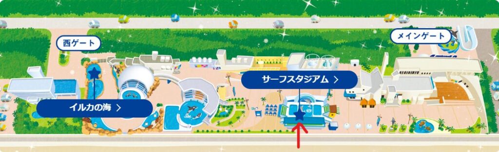 イルカショーが開催されているサーフスタジアムは左右に入口があります。