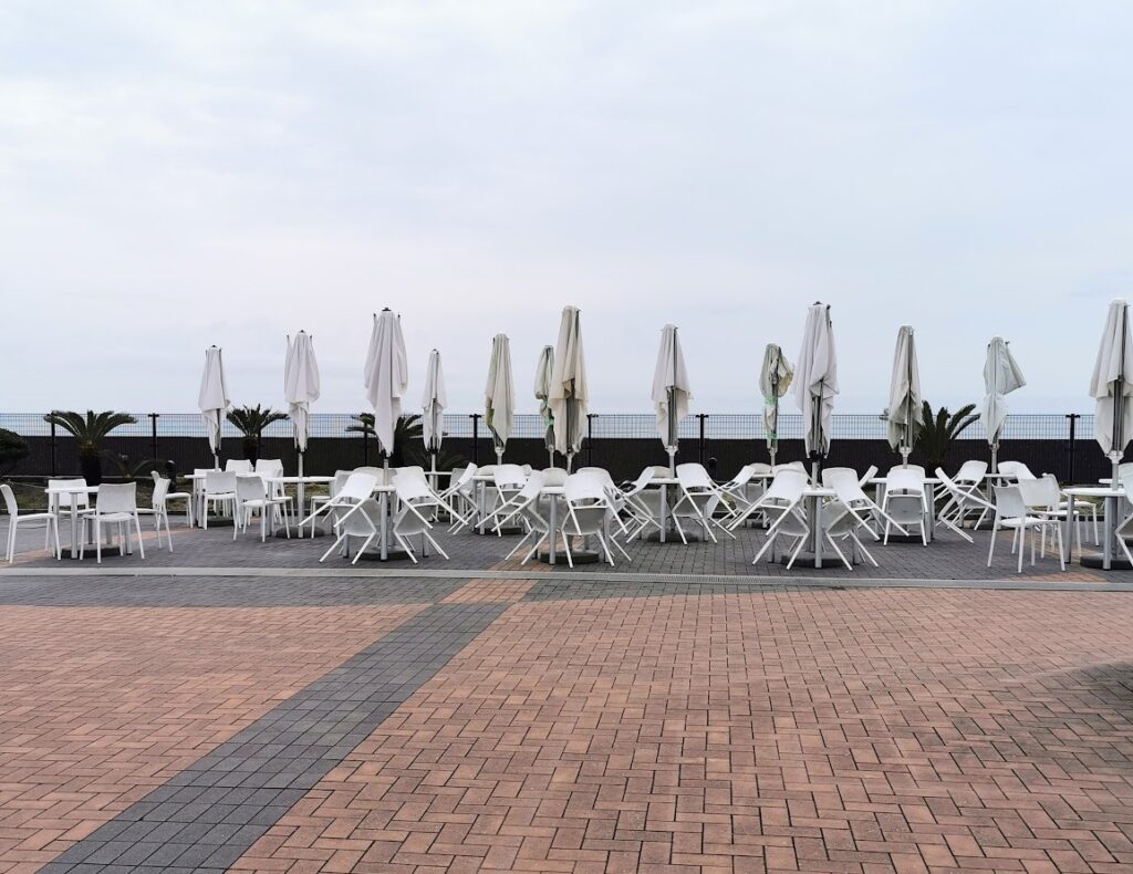 キッチンカーや屋台スタンドはオーシャンスタジアムとサーフスタジアムの間、もしくはサーフスタジアムとマリンスタジアムの間に集まっており、そのエリアにテラス席がいくつも用意されていますので、どちらかのエリアに行ってみてください。
