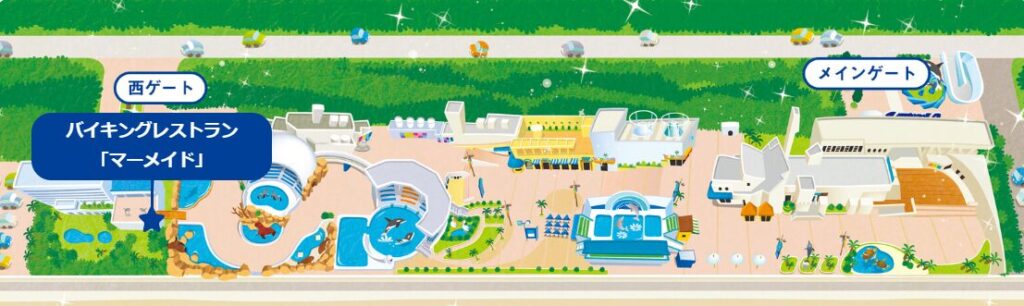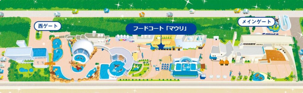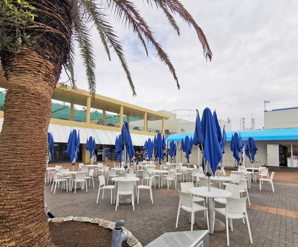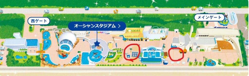 また、シャチショーをやっているオーシャンスタジアムや、イルカショーをサーフスタジアムの入り口付近にあるため、ショーの席取りしながらテイクアウトした物を食べる事もできます。