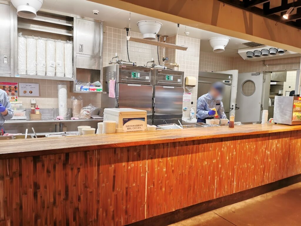入口付近にある券売機でチケットを買い、キッチンカウンターに持っていき、その場で食事を受け取り、席に持っていく流れになります。