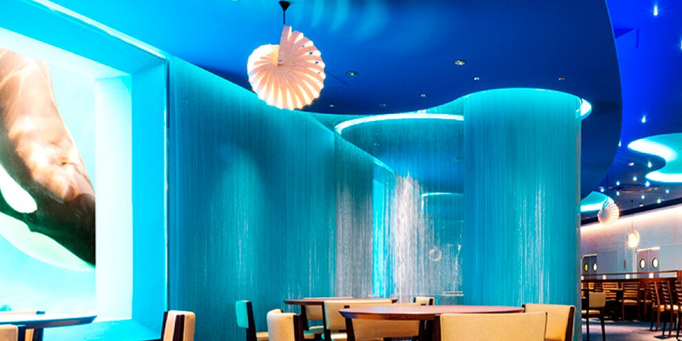 「オーシャン」の店内は、水中や白い砂浜をイメージしたカフェテリア形式のエリアと、洞窟(CAVE)をイメージしたフルサービスのエリアに分かれており、空間デザイン賞(DSA空間デザイン賞2014)を受賞しています。