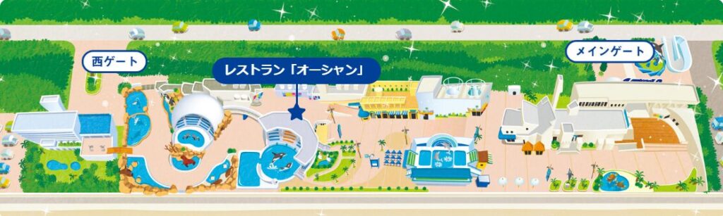 「オーシャン」はシャチショーが行われるオーシャンスタジアムの下にあります。