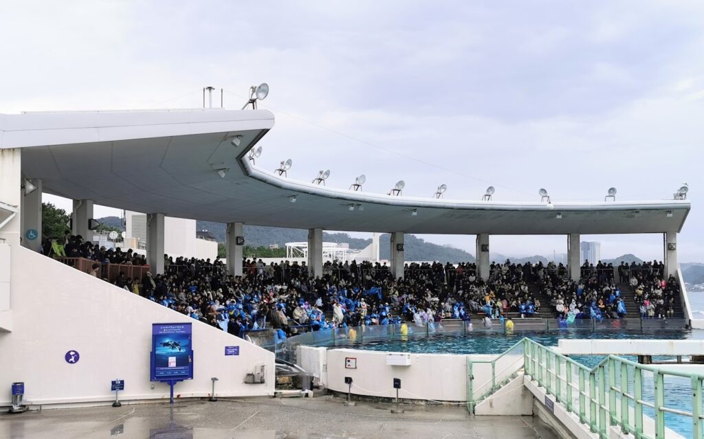 当日の2回目のショー(11時半)の7分前に取ったオーシャンスタジアム全体の写真ですが、前列も含めて、ほぼ満席の状態で、立見席にも多くの人が集まっていました。