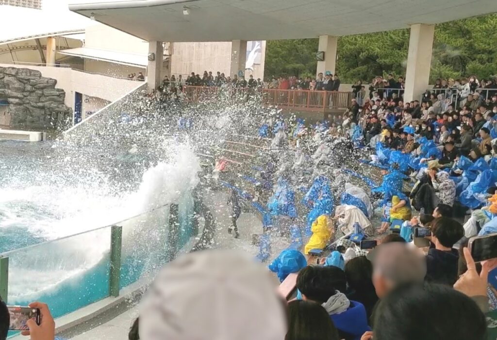 演技の最中に飛んでくる水しぶきだけでなく、シャチがわざと尾びれで水面をたたき、観客に向けてバシャバシャと水をかけるパフォーマンスがあるからです。